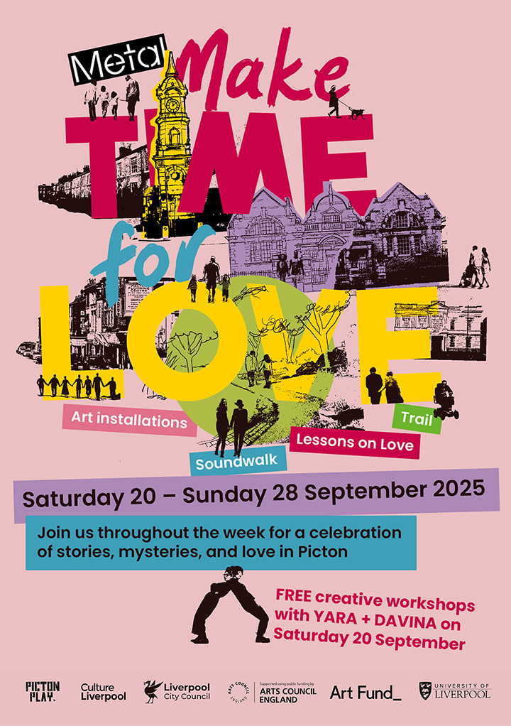 Make Time For Love is a project by arts organisation Metal, with artists YARA + DAVINA, commissioned by Culture Liverpool and Liverpool City Council. Make Time For Love is the finale of a 2-year residency called Picton Play with communities in L15, to celebrate the creativity that exists in the Wavertree and Picton neighbourhoods as part of Culture Liverpool’s Creative Neighbourhoods programme.