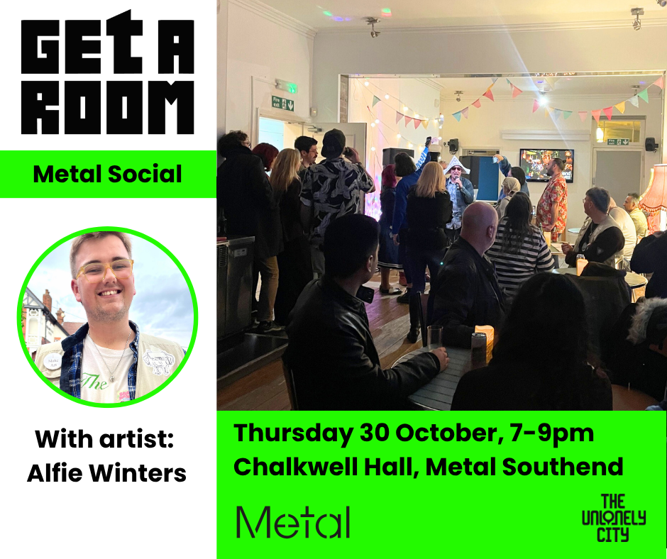 Metal Socials are part of Get a Room, Metal’s programme of artist-led hangouts for fun, solidarity, togetherness, and challenge in Liverpool, Peterborough, Southend and online. Get a Room asks, ‘what are the creative spaces we need for fruitful conversations and connection in these times?’